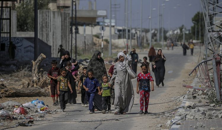 Εκτοπισμένοι Παλαιστίνιοι περπατούν δίπλα από κατεστραμμένα κτίρια κατά μήκος της ακτογραμμής της πόλης της Γάζας τη Δευτέρα. Πίστωση: Jehad Alshrafi/AP