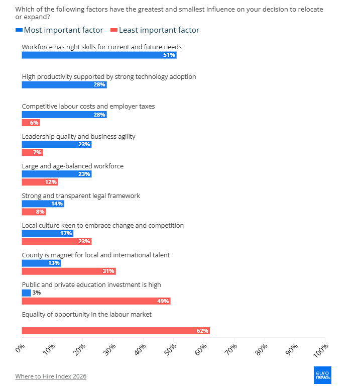 Η προτεραιότητα είναι να διαθέτουν τις κατάλληλες δεξιότητες για τις τρέχουσες και μελλοντικές θέσεις (51%), ενώ ακολουθεί η υψηλή παραγωγικότητα που υποστηρίζεται από ισχυρές τεχνολογικές ικανότητες (28%), παράλληλα με ανταγωνιστικούς φόρους εργασίας για τη διατήρηση των δαπανών σε χαμηλά επίπεδα (28%).