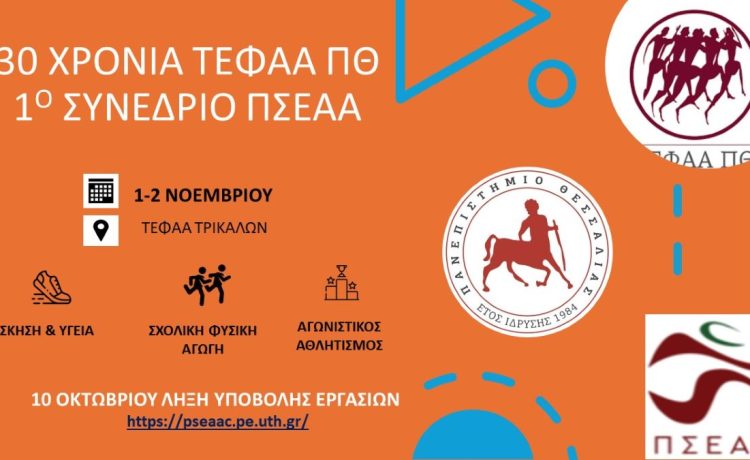 Το ΤΕΦΑΑ του Πανεπιστημίου Θεσσαλίας στα Τρίκαλα, γιορτάζει τα 30 χρόνια λειτουργίας του και στα πλαίσια των εορτασμών του, συνδιοργανώνει με τον Πανελλήνιο Σύλλογο Επαγγελματιών Αθλητισμού και Άσκησης (ΠΣΕΑΑ) το 1ο Πανελλήνιο Συνέδριο ΠΣΕΑΑ 1-2 Νοεμβρίου 2024 στις εγκαταστάσεις του ΤΕΦΑΑ στα Τρίκαλα.