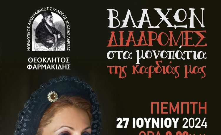 Την νέα του θεματική παράσταση με τίτλο : «Βλάχων διαδρομές στα μονοπάτια της καρδιάς μας» ανεβάζει ο Μ.Λ.Σ. Νίκαιας ¨ΘΕΟΚΛΗΤΟΣ ΦΑΡΜΑΚΙΔΗΣ ¨ σε συνδιοργάνωση με την Περιφέρεια Θεσσαλίας και τον Δήμο Λαρισαίων, στον χώρο του Κηποθέατρου, στο Αλκαζάρ της Λάρισας, στις 27 Ιουνίου 2024 στις 9:00 το βράδυ.
