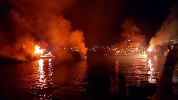 Πάρος: Με εντυπωσιακά καπνογόνα μπήκε πλοίο στο λιμάνι το βράδυ του Δεκαπενταύγουστου