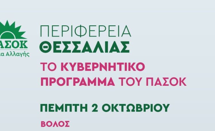 Εκδήλωση για την παρουσίαση – τεκμηρίωση του Κυβερνητικού Προγράμματος του ΠΑΣΟΚ -Κινήματος Αλλαγής, θα πραγματοποιηθεί την ερχόμενη Πέμπτη 2 Οκτωβρίου στον Βόλο, με με κεντρικό ομιλητή του εκπρόσωπο Τύπου του ΠΑΣΟΚ Κώστα Τσουκαλά. Θα συμμετέχουν επίσης ο γραμματέας του Τομέα Αγροτικής Ανάπτυξης και Τροφίμων κ. Θανάσης Πετρόπουλος, ο γραμματέας του δικτύου συνεταιρισμών και κοινωνικής οικονομίας κ. Αντώνης Πολίτης, ο αναπληρωτής γραμματέας θεσμών Θωμάς Παπαλιάγκας και η βουλευτής του νομού Λάρισας Ευαγγελία Λιακούλη.