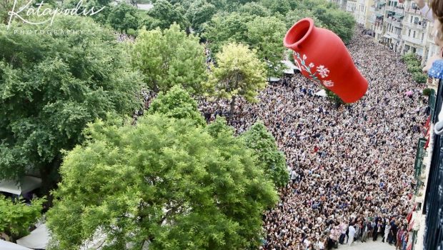 Από μπαλκόνι 3ου ορόφου στην πλατεία Σπιανάδα πέταξε τον πρώτο μπότη που έπεσε – με τον κόσμο να παρακολουθεί με ενθουσιασμό.