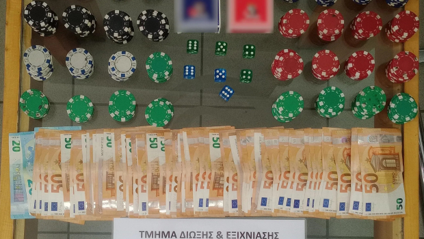 Οι αστυνομικοί κατά την έρευνα τους στο κατάστημα βρήκαν και κατάσχεσαν ως πειστήρια 3.865 ευρώ, 314 μάρκες, 2 τράπουλες και 7 ζάρια.