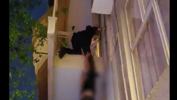 Η αστυνομικός κρατιέται από έναν σωλήνα στον εξωτερικό τοίχο της πολυκατοικίας και πατάει στους ώμους συναδέλφου της που την κρατάει. Ρισκάρει τη ζωή της.