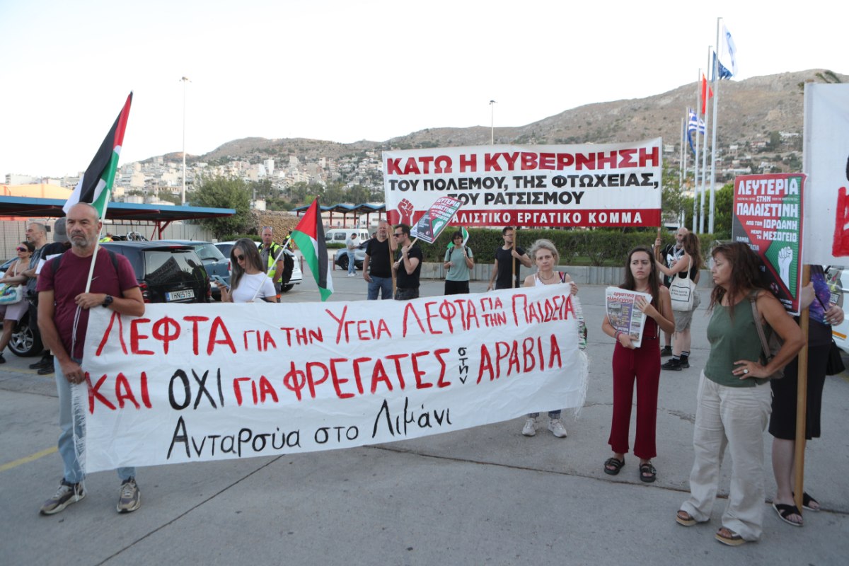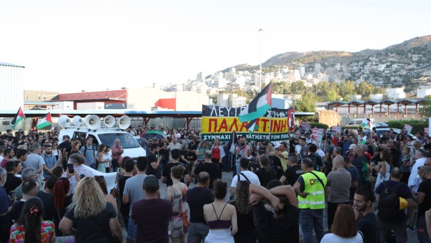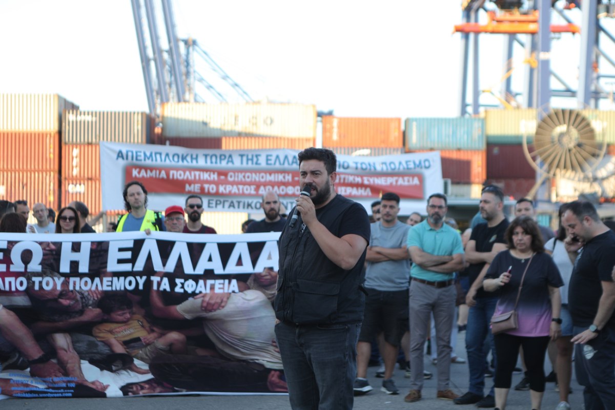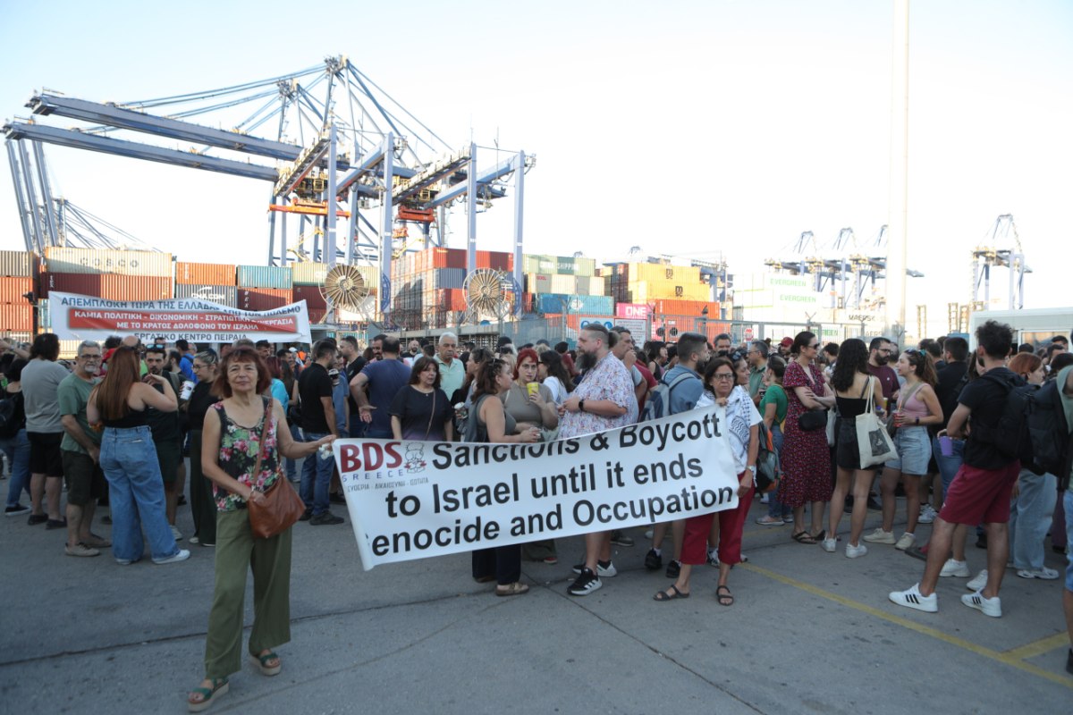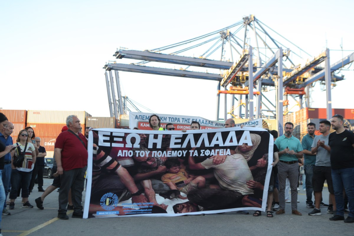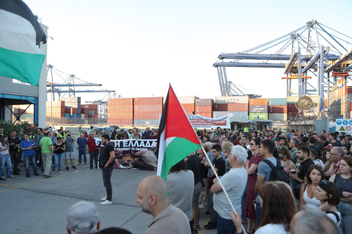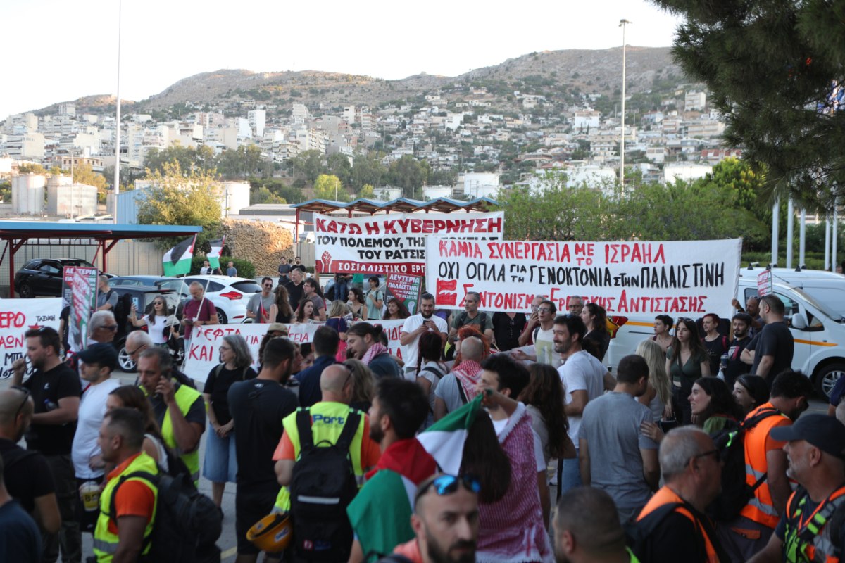 Μαζική συγκέντρωση πραγματοποιήθηκε τα ξημερώματα της Δευτέρας στις προβλήτες 2 και 3 της Cosco, μετά από κάλεσμα της Ένωσης Εργαζομένων Διακίνησης Εμπορευματοκιβωτίων στις προβλήτες του Πειραιά (ΕΝΕΔΕΠ) ενάντια στην αποστολή στρατιωτικού υλικού στο Ισραήλ που συνεχίζει τον πόλεμό του στη Γάζα.
