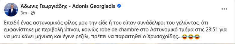 «Επειδή ένας αστυνομικός φίλος μου την είδε ή του είπαν συνάδελφοί του, γελώντας, ότι εμφανίστηκε με περιβολή ύπνου, κοινώς robe de chambre, στο Αστυνομικό Τμήμα στις 23:51 για να μου κάνει μήνυση και έγινε ρεζίλι, πρέπει να παραιτηθεί ο Χρυσοχοΐδης»…