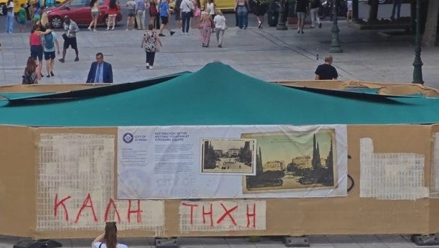 Την απορία των περαστικών έχει προκαλέσει το καλυμμένο σιντριβάνι στην Πλατεία Συντάγματος, το οποίο θα μείνει εκτός λειτουργίας για να πραγματοποιηθούν εργασίες συντήρησης.