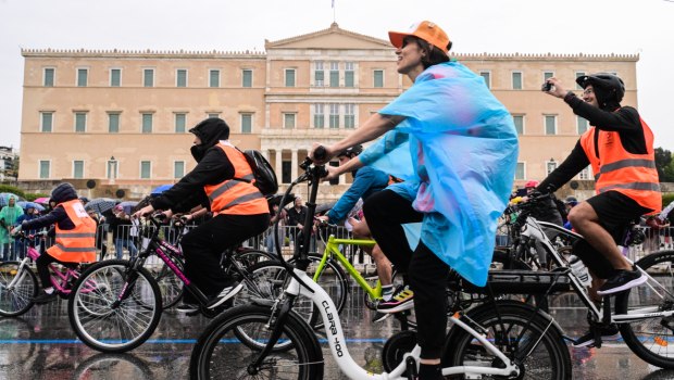 Παρά τη βροχή χιλιάδες ποδηλάτες, πήραν μέρος στον 29ο Ποδηλατικού Γύρο στο κέντρο της Αθήνας.