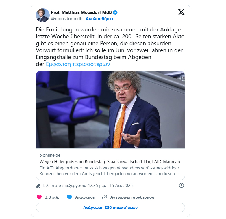 Σημειώνεται, ότι ο ναζιστικός χαιρετισμός είναι παράνομος στη Γερμανία και τιμωρείται με φυλάκιση έως τριών ετών. Πρόκειται για τον 60χρονο Ματίας Μούσντορφ, μέλος του κοινοβουλίου με το AfD για την πόλη Τσβικάου.