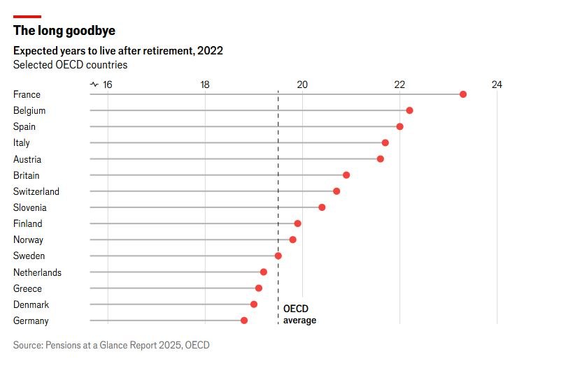 Οι χώρες  που γερνούν πιο γρήγορα προσφέρουν ήδη από τις πιο γενναιόδωρες συντάξεις και χαμηλά όρια συνταξιοδότησης. Ο μέσος Γάλλος συνταξιούχος λαμβάνει σύνταξη επί 23 χρόνια — περισσότερο από κάθε άλλη χώρα του ΟΟΣΑ. Στη Δανία, ο μέσος όρος είναι 19 χρόνια, ενώ η κυβέρνηση σχεδιάζει να αυξήσει την ηλικία συνταξιοδότησης στα 70 έως το 2040, την υψηλότερη στην Ευρώπη.