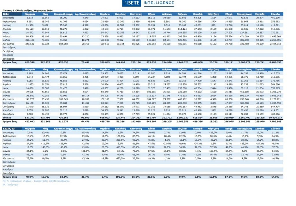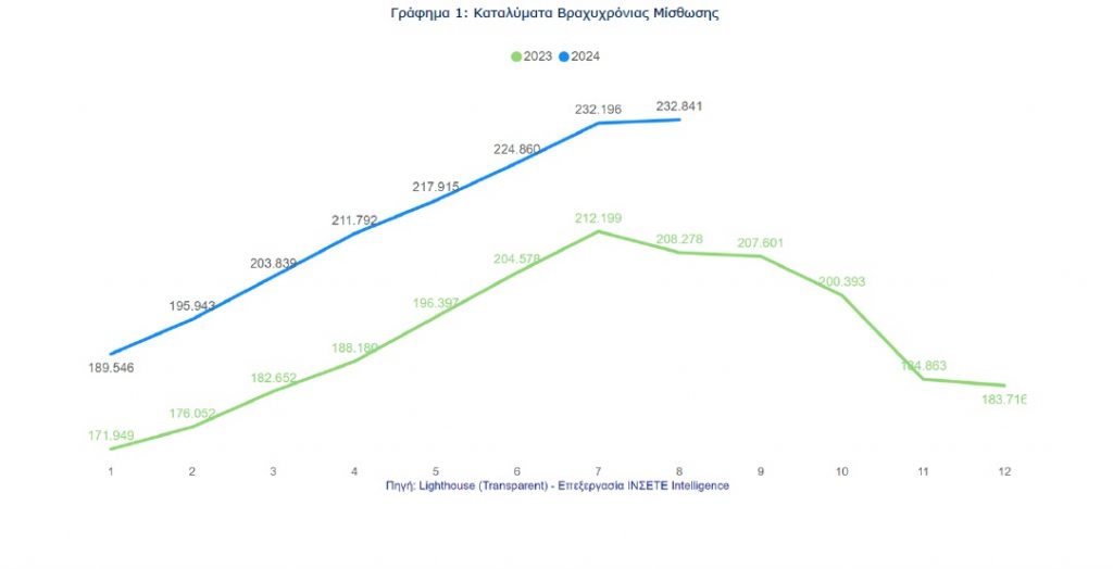 Τον Ιούλιο του 2024, τα καταλύματα έφτασαν τις 232 χιλ., σημειώνοντας αύξηση κατά +20 χιλ. σε σχέση με τον Ιούλιο του 2023. Τον Αύγουστο του 2024, σε αντίθεση με τον περυσινό Αύγουστο που παρατηρήθηκε μείωση, τα καταλύματα συνέχισαν να αυξάνονται, φτάνοντας τις 233 χιλ., παρουσιάζοντας ελαφριά άνοδο σε σύγκριση με τον Ιούλιο και σημειώνοντας αύξηση κατά +25 χιλ. σε σχέση με τον Αύγουστο του 2023.