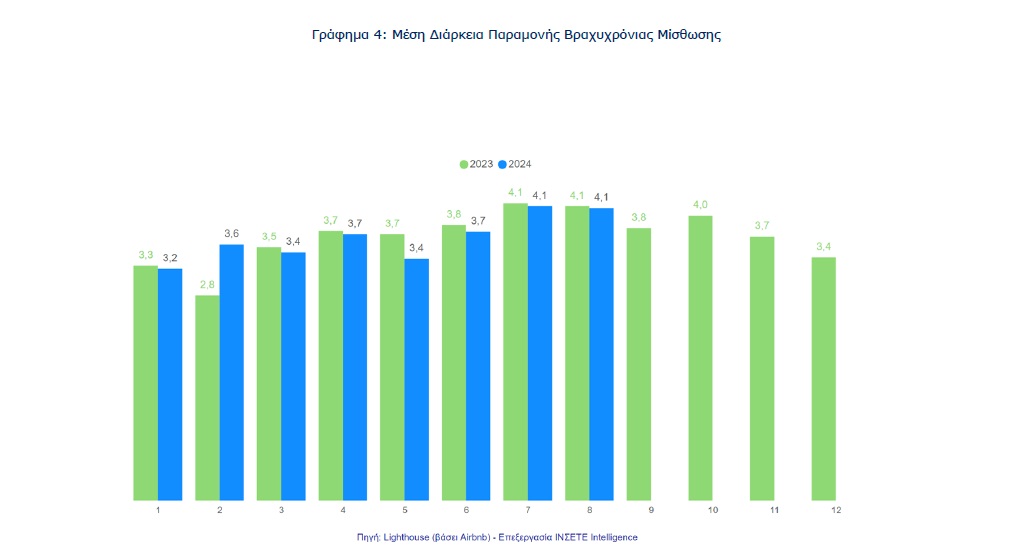 Η μέση διάρκεια παραμονής σε διανυκτερεύσεις την περίοδο Ιανουαρίου-Αυγούστου 2024, συγκρινόμενη με την αντίστοιχη του 2023, ήταν οριακά μειωμένη όλους τους μήνες με εξαίρεση τον Φεβρουάριο που παρουσίασε αύξηση. Τους καλοκαιρινούς μήνες η μέση διάρκεια παραμονής είναι μεγαλύτερη.
