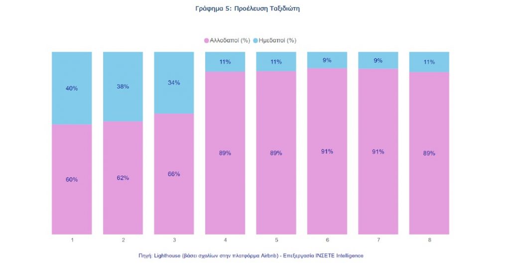 Η διάρθρωση των ταξιδιωτών στο πλαίσιο της βραχυχρόνιας μίσθωσης μέσα στη διάρκεια του έτους εμφανίζει μια ενδιαφέρουσα δυναμική στη σύνθεση των ταξιδιωτών μεταξύ αλλοδαπών και ημεδαπών το Α’ τρίμηνο του 2024, με τους αλλοδαπούς να κυριαρχούν σημαντικά το Β’ τρίμηνο του 2024. Ειδικότερα, το Α’ τρίμηνο η αναλογία των αλλοδαπών κυμαίνεται μεταξύ 60% και 66%. Ωστόσο, με την έναρξη της τουριστικής σεζόν τον Απρίλιο, το ποσοστό των ημεδαπών εκτοξεύεται στο 89%, φτάνοντας στο υψηλότερο σημείο του έτους με 91% τον Ιούνιο και Ιούλιο.
