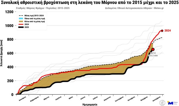 Σύμφωνα με τις καταγραφές του δικτύου μετεωρολογικών σταθμών του ΜΕΤΕΟ/ΕΑΑ, το τετραήμερο 03-06/12/2025, μόνο 43 χιλιοστά κατεγράφησαν στο σταθμό του Κονιάκου και 49 χιλιοστά στο σταθμό στο Φράγμα Μόρνου.