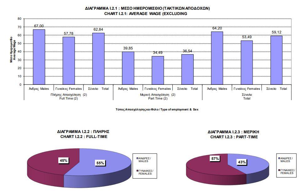Στην πρώτη περίπτωση το μέσο ημερομίσθιο εργαζομένων πλήρους απασχόλησης ανήλθε σε 62,84 ευρώ και ο μέσος μισθός σε 1467,39 ευρώ ενώ για μερικής απασχόλησης το μέσο ημερομίσθιο ήταν 36,54 ευρώ και ο μέσος μισθός 603 ευρώ. Στο σύνολο των εργαζομένων το μέσο ημερομίσθιο διαμορφώθηκε σε 59,12 ευρώ και ο μέσος μισθός σε 1305,39 ευρώ.