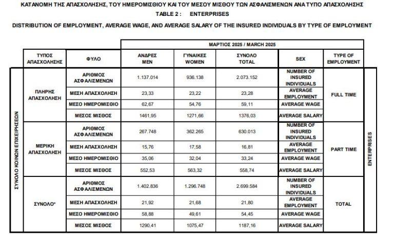Στο σύνολο των εργαζομένων τον Μάρτιο 2025, ο μέσος μισθός διαμορφώθηκε στα 1187,16 ευρώ (από 1195,50 ευρώ τον Ιανουάριο 2025) και το μέσο ημερομίσθιο στα 54,45 ευρώ (από 54,40 ευρώ).