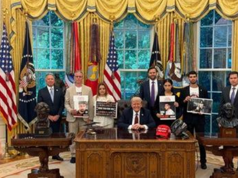 Ο Πρόεδρος των ΗΠΑ Ντόναλντ Τραμπ με οικογένειες ομήρων και απελευθερωμένους ομήρους στον Λευκό Οίκο την Τετάρτη (8/10). Πίστωση: Φόρουμ Ομήρων και Αγνοούμενων Οικογενειών