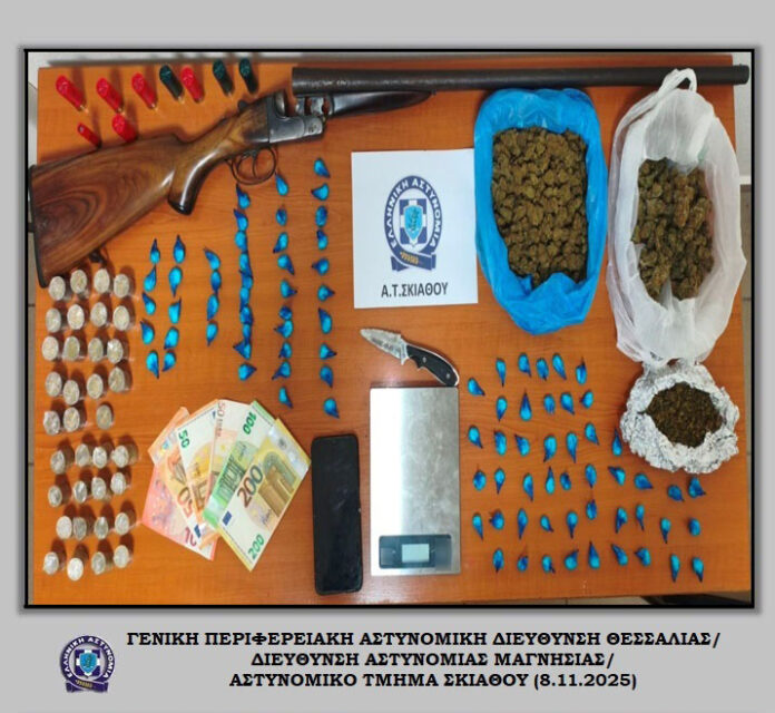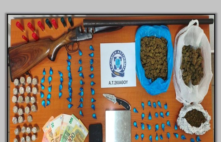 Ο άνδρας συνελήφθη το μεσημέρι της Παρασκευής στην Σκιάθο, από αστυνομικούς του Αστυνομικού Τμήματος Σκιάθου και σε βάρος του οποίου σχηματίστηκε δικογραφία για παράβαση της νομοθεσίας περί ναρκωτικών και της νομοθεσίας περί όπλων.
