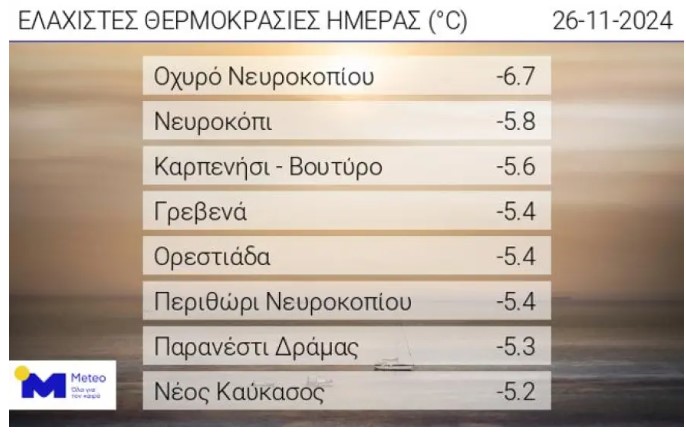 Ο Τάσος Αρνιακός προέβλεψε πως θα πέσουν χιόνια το βράδυ του Σαββάτου (30/11) και την Κυριακή (1/12) στα κεντρικά, τα βόρεια ορεινά, τα βουνά της Εύβοιας και της Πελοποννήσου καθώς επίσης και σε ημιορεινές περιοχές της Πίνδου και της Μακεδονίας.