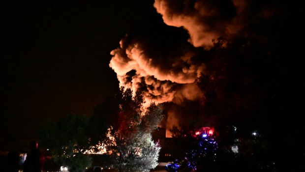 Ολοσχερώς καίγονται οι εγκαταστάσεις του εργοστασίου που παράγει πλαστικά στη βιομηχανική ζώνη στα Μέγαρα.