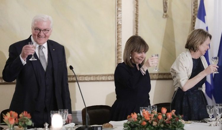 Ο Πρόεδρος της Γερμανίας Φράνκ-Βάλτερ Σταϊνμάιερ ξεκίνησε την αντιφώνησή του, με Οδυσσέα Ελύτη, υπενθυμίζοντας τα λόγια του Έλληνα ποιητή κατά την απονομή του Νόμπελ Λογοτεχνίας το 1979, όταν είχε δηλώσει «Το μόνο κεφάλαιο στα χέρια μου μερικές λέξεις ελληνικές. Είναι ταπεινές αλλά ζωντανές, αφού βρίσκονται στα χείλη ενός ολόκληρου λαού. Είναι ηλικίας τριών χιλιάδων χρόνων αλλά δροσερές σαν μόλις να τις ανέσυρες από την θάλασσα (…) Είναι η λέξη ουρανός, είναι η λέξη θάλασσα, είναι η λέξη ήλιος και είναι και η λέξη ελευθερία.».
