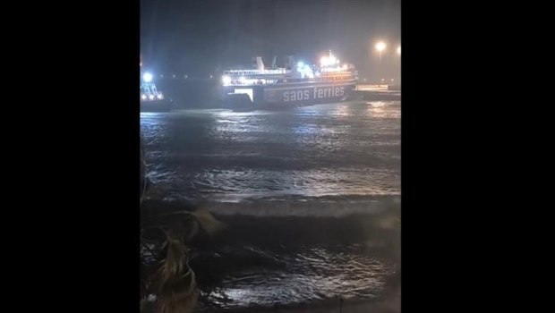 Την ίδια ώρα πλοίο έδωσε μάχη με τους ισχυρούς ανέμους για να δέσει στο λιμάνι.
