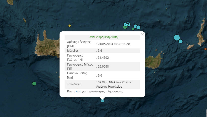 Σύμφωνα με το Γεωδυναμικό Ινστιτούτο, το μέγεθος της δόνησης είναι 3,6 Ρίχτερ ενώ το επίκεντρο εντοπίζεται 59 χιλιόμετρα νότια νοτιοανατολικά του Ηρακλείου.