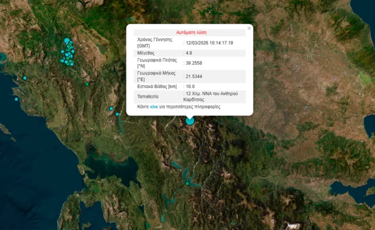 Σεισμική δόνηση, μεγέθους 4,8 Ρίχτερ σύμφωνα με το Γεωδυναμικό Ινστιτούτου του Αστεροσκοπείου Αθηνών, σημειώθηκε στις 12:14 το μεσημέρι της Πέμπτης, με επίκεντρο ορεινή περιοχή μεταξύ Καρδίτσας, Αρτας και Ευρυτανίας. Ειδικότερα, το επίκεντρο εντοπίζεται 11 Χλμ. ΒΑ του Ραπτόπουλου Ευρυτανίας. Ο σεισμός έγινε αισθητός στην ευρύτερη περιοχή της Θεσσαλίας, την Ευρυτανία και την Άρτα.