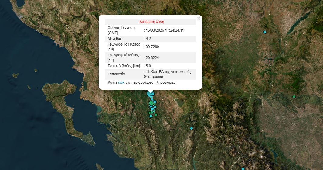 Σεισμός 4,2 Ρίχτερ σημειώθηκε αργά το απόγευμα της Δευτέρας με επίκεντρο τη Λεπτοκαρυά Θεσπρωτίας.