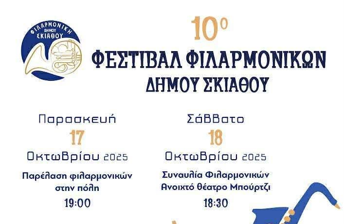 Ο Δήμος Σκιάθου διοργανώνει το 10ο Φεστιβάλ Φιλαρμονικών στις 17 και 18 Οκτωβρίου 2025, σε συνδιοργάνωση με την Περιφέρεια Θεσσαλίας.