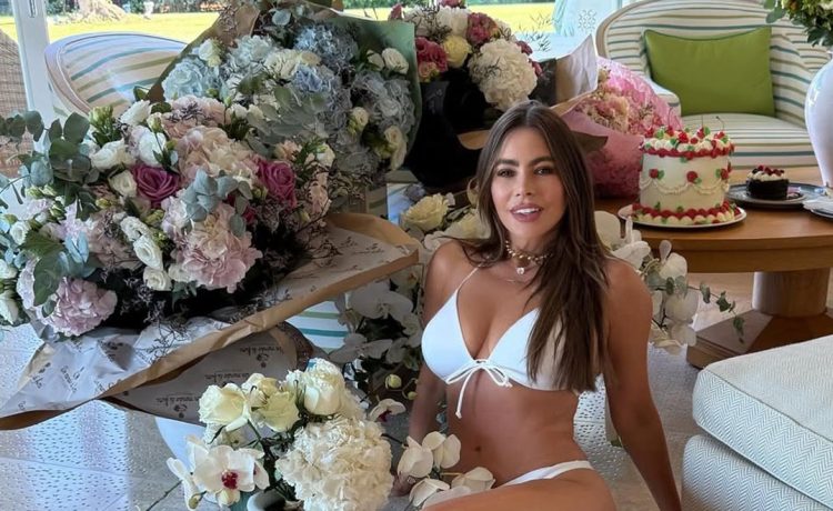 Σε ένα από τα καρέ η 53χρονη πλέον Vergara φοράει ένα λευκό μπικίνι και ποζάρει μπροστά από μπουκέτα με λουλούδια και μια τούρτα.