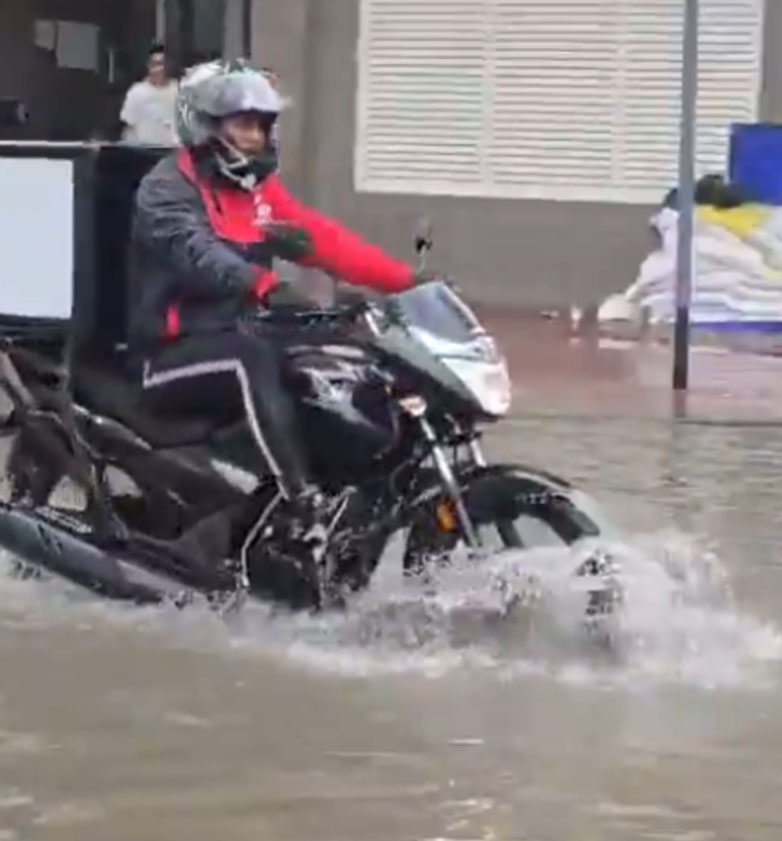 Διανομέας διασχίζει πλημμυρισμένο δρόμο