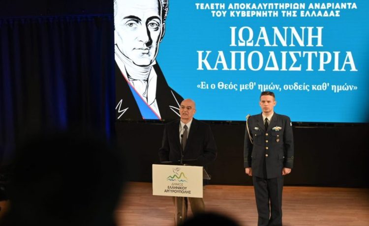 Ο υπουργός Εθνικής ‘Αμυνας Νίκος Δένδιας παρέστη, σήμερα, Κυριακή 1η Φεβρουαρίου, στην τελετή αποκαλυπτηρίων του ανδριάντα του Ιωάννη Καποδίστρια στην Αργυρούπολη και στην τελετή της μετονομασίας της πλατείας Δημαρχείου σε πλατεία Κυβερνήτη Ιωάννη Καποδίστρια.