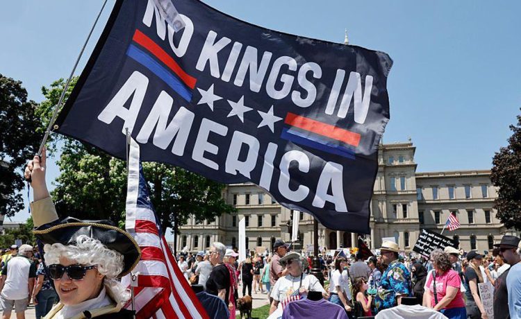 Στην πολιτεία του Μίσιγκαν, στο Λάνσινγκ, ένας διαδηλωτής κρατούσε ένα πλακάτ που έγραφε «Όχι Βασιλιάδες, Όχι ICE, Όχι Πόλεμος».