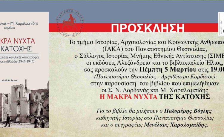 Την Πέμπτη 5 Μαρτίου 2026, στις 7 μ.μ., στο αμφιθέατρο «Κορδάτος» του Πανεπιστήμιο Θεσσαλίας (συγκρότημα Παπαστράτου), θα πραγματοποιηθεί η πρώτη παρουσίαση του νέου συλλογικού τόμου «Η μακρά νύχτα της Κατοχής. Ανθρώπινες απώλειες και υλικές καταστροφές στην κατεχόμενη Ελλάδα (1941-1944)», που κυκλοφόρησε τον Νοέμβριο του 2025 από τις Εκδόσεις Αλεξάνδρεια. Την εκδήλωση συνδιοργανώνουν το Τμήμα Ιστορίας, Αρχαιολογίας και Κοινωνικής Ανθρωπολογίας του Πανεπιστημίου Θεσσαλίας και ο Σύλλογος Ιστορίας και Μνήμης Εθνικής Αντίστασης, ενώ τη διάθεση του βιβλίου έχει αναλάβει το βιβλιοπωλείο «Ήλιος» του Χρήστου Αγιώτη. Η είσοδος θα είναι ελεύθερη.