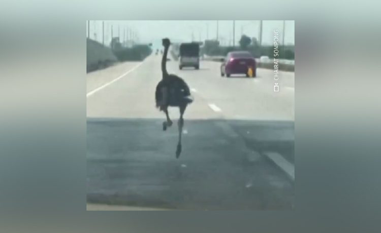 Η εικόνα θα μπορούσε να είναι βγαλμένη από σουρεαλιστική ταινία: μια στρουθοκάμηλος, με βήμα που θυμίζει μαραθωνοδρόμο που κοντεύει να φτάσει στον τερματισμό, διασχίζει έναν αυτοκινητόδρομο στην Ταϊλάνδη, με τους οδηγούς να να μην πιστεύουν στα μάτια τους με το θέαμα που αντίκρισαν.