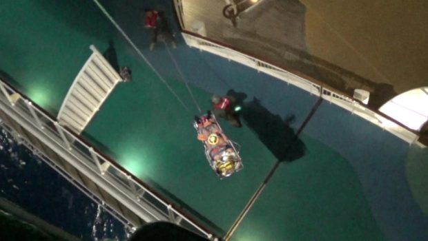Το πλήρωμά του με χειρουργικές κινήσεις δένει τον ασθενή στο φορείο και στη συνέχεια ένα σχοινί τον τραβά προς τα επάνω για να μεταφερθεί στη Ρόδο.