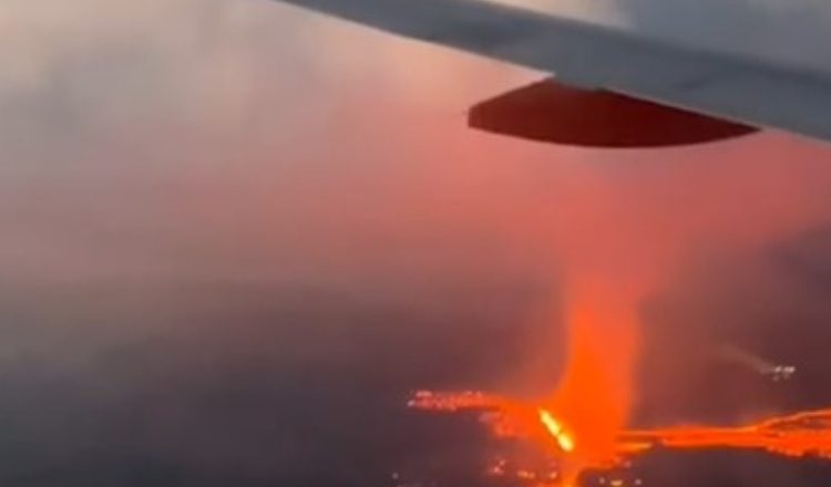 Το βίντεο εξασφάλισε η Kayleigh Patter, απαθανατίζοντας τη στιγμή που η πτήση περνά πάνω από το «οργισμένο» ηφαίστειο, και ένα πορτοκαλί τοπίο πνιγμένο στην καυτή λάβα.