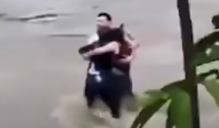 Βίντεο καταγράφει τη στιγμή που αγκαλιάζονται εγκλωβισμένοι μέσα στα ορμητικά νερά, αδυνατώντας να φθάσουν στην όχθη του ποταμού ενώ είναι σε εξέλιξη προσπάθειες διάσωσής τους.