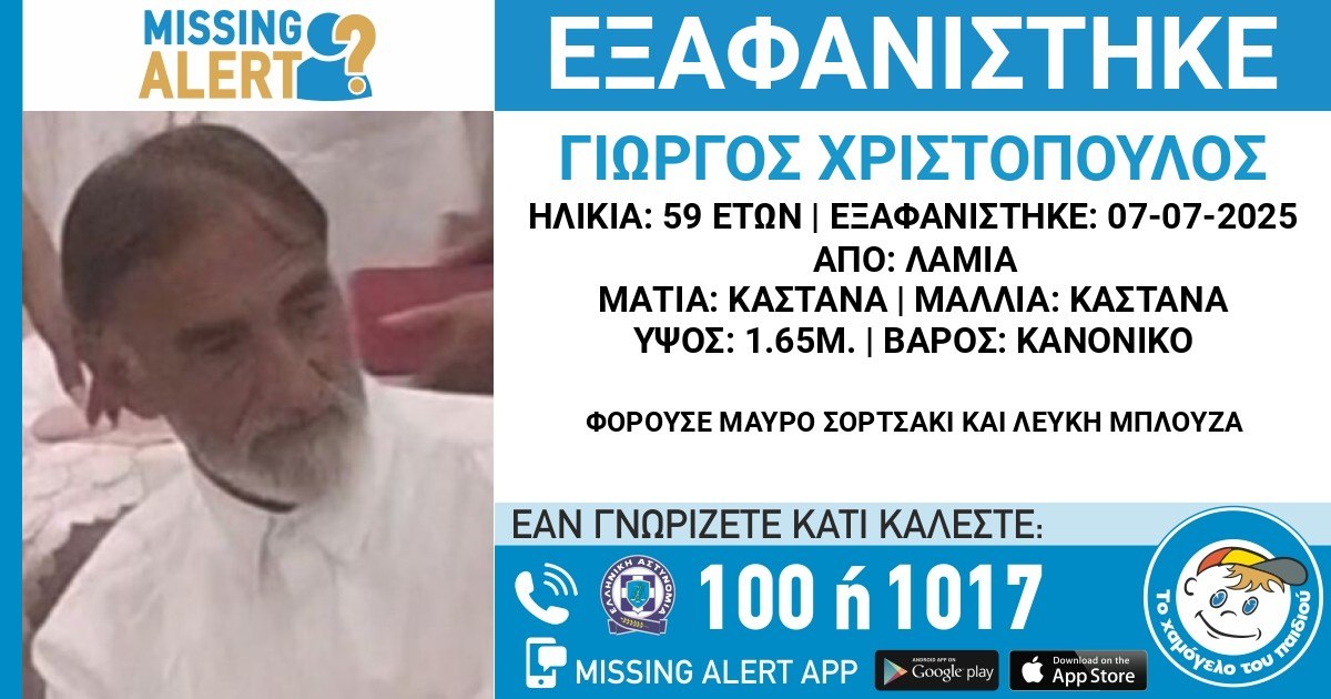Ειδικότερα, στις 7 Ιουλίου το μεσημέρι, εξαφανίστηκε από την περιοχή της Λαμίας ο 59χρονος Γιώργος Χριστόπουλος. «Το Χαμόγελο του Παιδιού» ενημερώθηκε στις 8 Οκτωβρίου για την εξαφάνιση του και προχώρησε στη δημοσιοποίηση των στοιχείων του 59χρονου κατόπιν αιτήματος της οικογένειας του, καθώς ενδέχεται να συντρέχουν λόγοι οι οποίοι θέτουν τη ζωή του σε κίνδυνο. Σημειώνεται ότι υπάρχουν πληροφορίες, σύμφωνα με τη σχετική ανακοίνωση, πως ενδέχεται να βρίσκεται στην περιοχή των Χανιών Κρήτης.