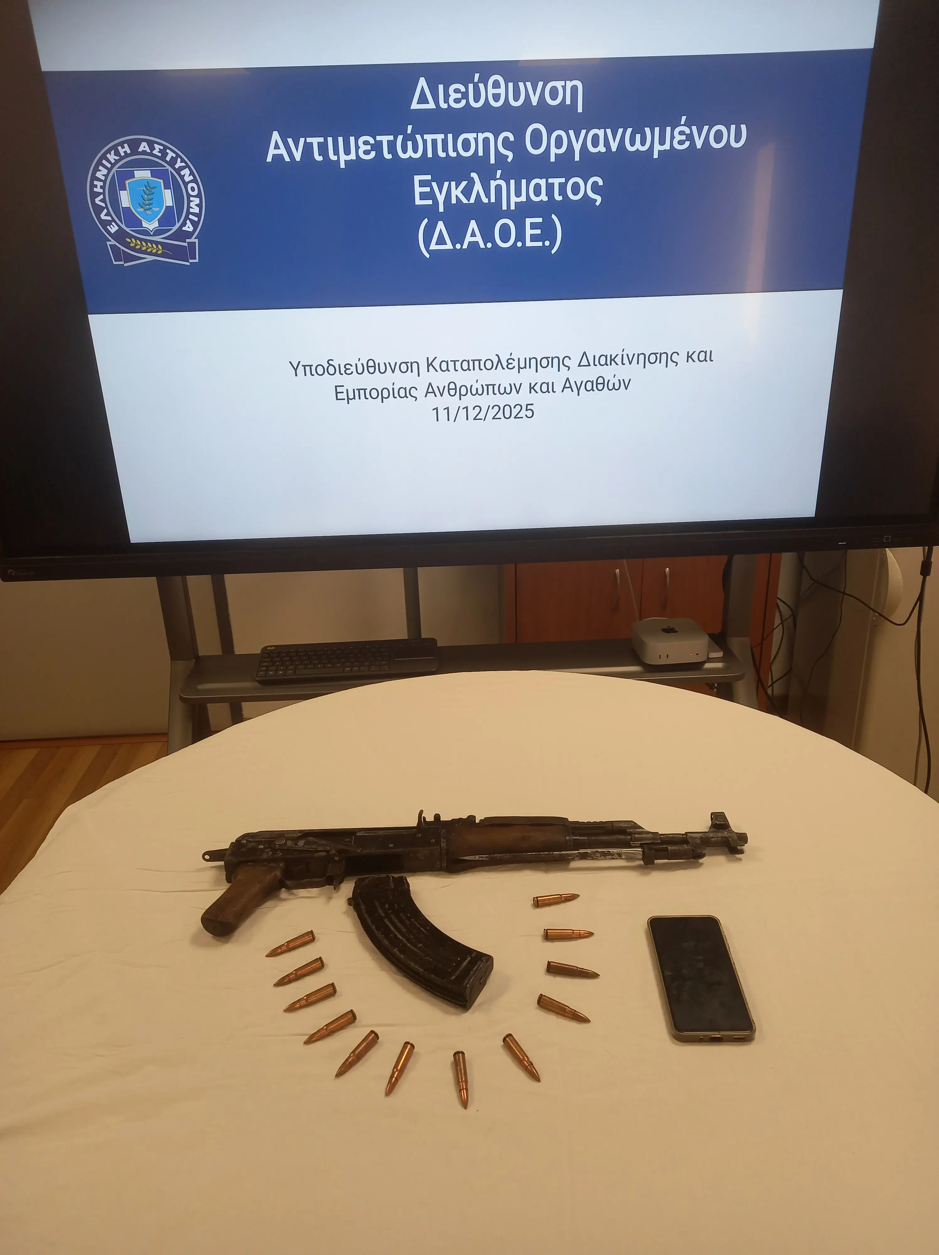 Από την Υποδιεύθυνση Καταπολέμησης Διακίνησης και Εμπορίας Ανθρώπων και Αγαθών της Διεύθυνσης Αντιμετώπισης Οργανωμένου Εγκλήματος συνελήφθη πρώτες πρωινές ώρες χθες, Πέμπτη 11 Δεκεμβρίου 2025, σε περιοχή της Αθήνας, 20χρονος ημεδαπός, ο οποίος κατείχε και μετέφερε πολεμικό τυφέκιο «Kalashnikov».