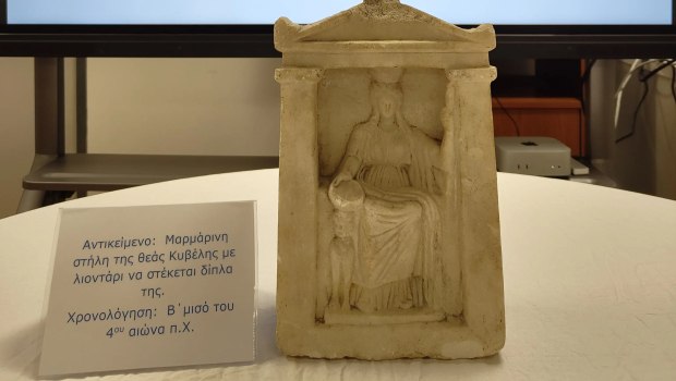Στο πλαίσιο της έρευνας, εντοπίστηκε κρυμμένη σε πατάρι και κατασχέθηκε μια μαρμάρινη ναόσχημη αναθηματική στήλη (ένθρονη θεά Κυβέλη με ένα λιοντάρι δίπλα της), η οποία χρονολογείται στον 4ο π.Χ. αιώνα.
