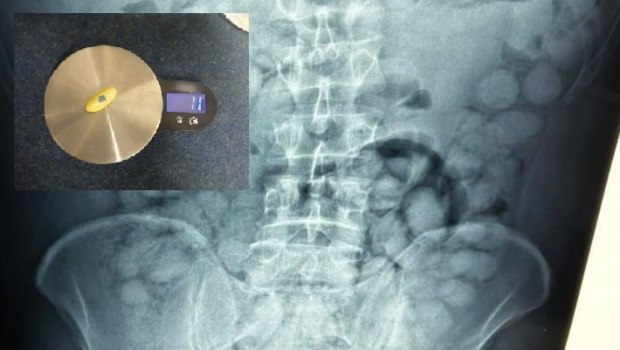 Στις ακτινογραφίες διακρίνονται οι συσκευασίες που είχε καταπιεί με τους γιατρούς να εντοπίζουν 100 κάψουλες των 11 γραμμαρίων η καθεμία.