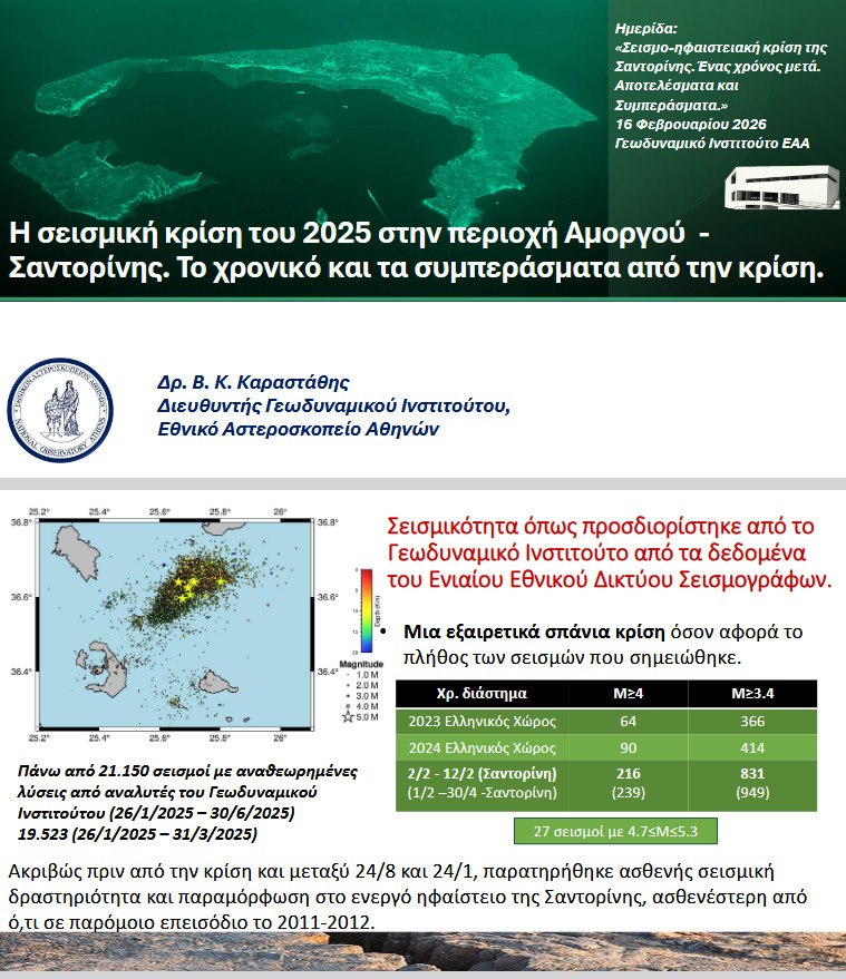 Στην Ημερίδα που πραγματοποιήθηκε στο αμφιθέατρο του Γεωδυναμικού Ινστιτούτου του Εθνικού Αστεροσκοπείου Αθηνών, ο κ. Καραστάθης ανέλυσε το προφίλ της σεισμο-ηφαιστειακής κρίσης στο νησί, τον Φεβρουάριο του 2025, περιγράφοντας ταυτόχρονα όσα πρωτοφανή κλήθηκαν να αποκωδικοποιήσουν οι επιστήμονες σε ζωντανό χρόνο.