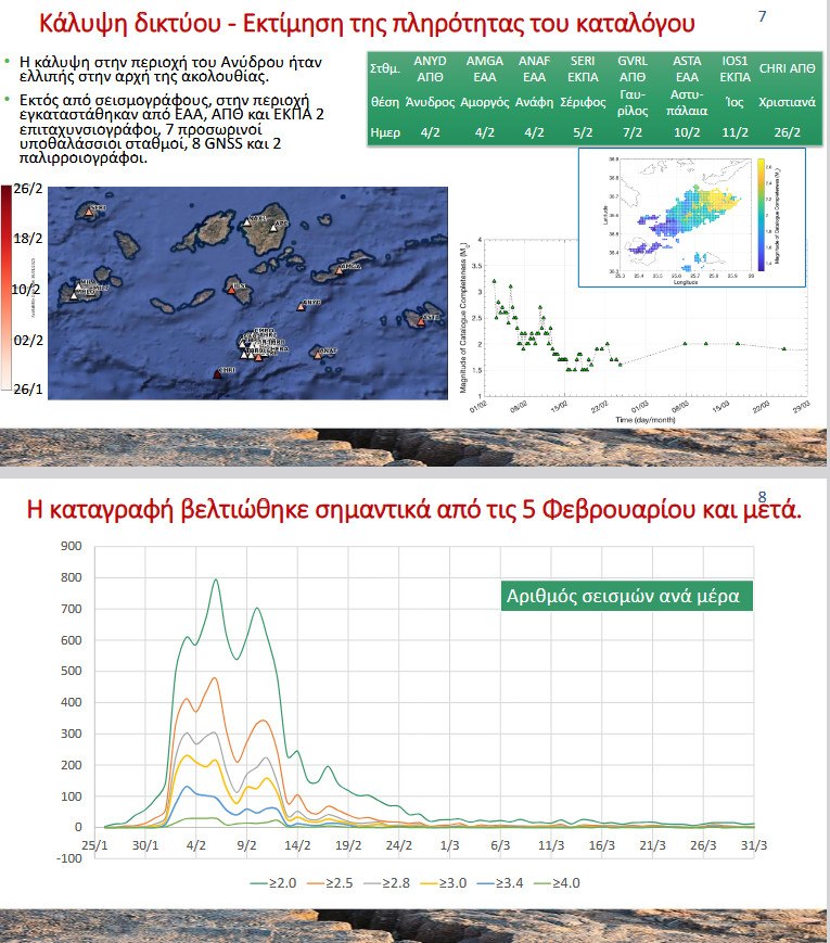 Αναλύοντας περαιτέρω τις εξαιρετικά δύσκολες συνθήκες κάτω από τις οποίες εργάζονταν οι επιστήμονες, ο κ. Καραστάθης σημείωσε πως όταν ξεκίνησε η σεισμική κρίση, η κάλυψη του δικτύου για την παρακολούθηση τςη σεισμικότητας ήταν πλημμελής. «Ολοι οι εμπλεκόμενοι, επιστήμονες αλλά και οι αρμόδιοι από το υπουργείο Κλιματικής Κρίσης και Πολιτικής Προστασίας, τρέξαμε μέσα σε δύο μέρες για να εγκατασταθούν όλα τα απαραίτητα όργανα».