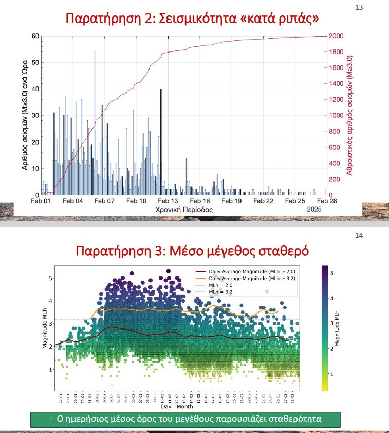- Η σεισμικότητα σημειωνόταν «κατά ριπάς». Στις 5 Φεβρουαρίου 2025 καταγράφηκαν 53 σεισμοί μέσα σε μια ώρα. Υπήρχαν ώρες που σχεδόν κάθε λεπτό τους καταγράφηκε αισθητός σεισμός.
