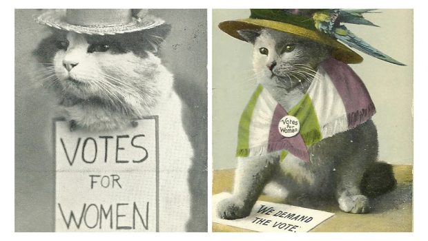 Αν μη τι άλλο, τα γατιά είναι χαριτωμένα («Θέλω τη μαμά μου» λέει το γατάκι αριστερά. «Θέλω την ψήφο μου» φωνάζει το γατί στα δεξιά (Καρτ-ποστάλ των αρχών του 20ού αιώνα (Edwardian Postcard Project, Lancaster University)