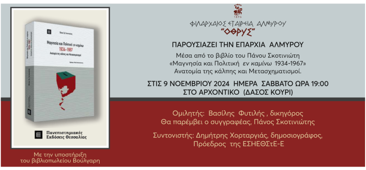 Το βιβλίο “Μαγνησία και Πολιτική εν καμίνω, 1934-1967” του Π. Σκοτινιώτη παρουσιάζει η Φιλάρχαιος Εταιρεία Αλμυρού