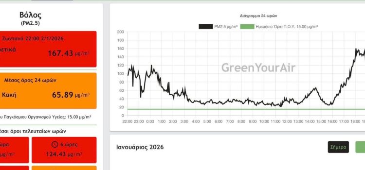 Στο «κόκκινο» βρέθηκε χθες το βράδυ η αερορύπανση στον Βόλο, σύμφωνα με τα στοιχεία που καταγράφει σε πραγματικό χρόνο το δίκτυο παρακολούθησης αέρα GreenYourAir. Όπως αναφέρεται στην ιστοσελίδα, στις 10 το βράδυ οι τιμές των αιωρούμενων μικροσωματιδίων PM2,5 έφτασαν τα...